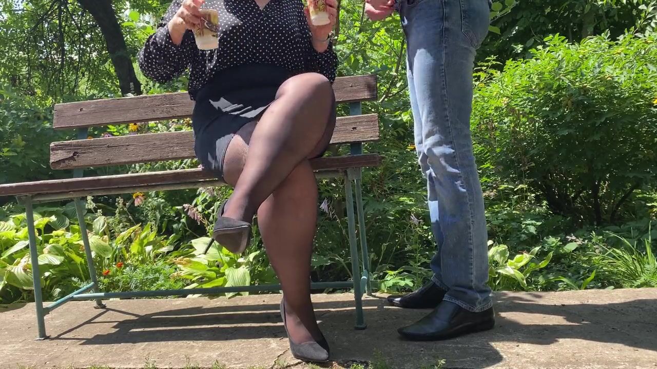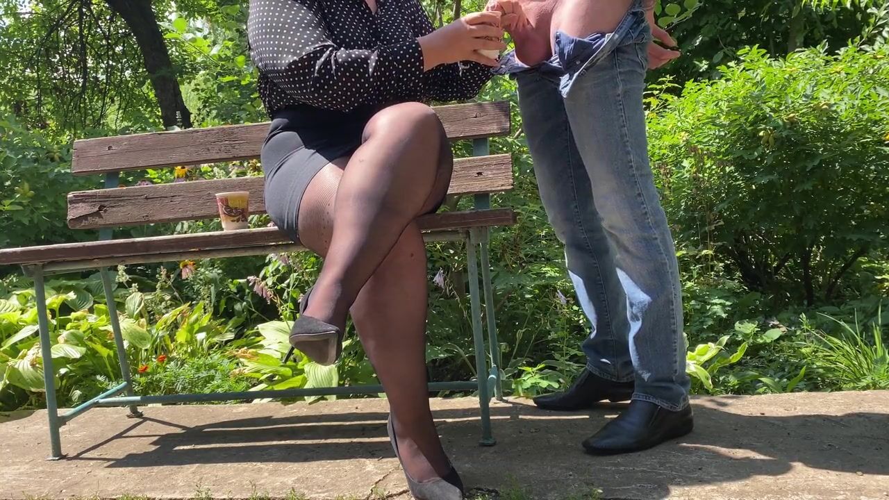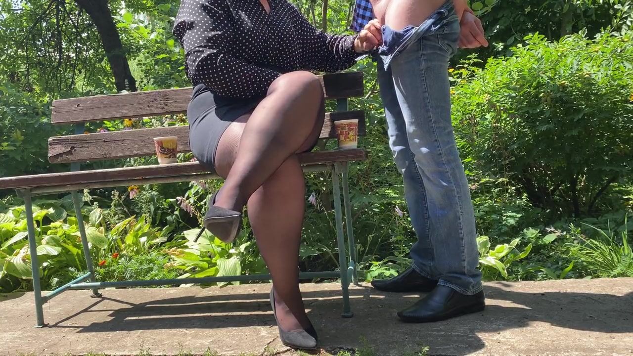 Hot MILF milked big cock cum into her coffee outdoors in the park